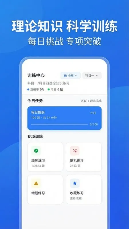 驾考科目一路通是为驾校学员打造的试题类 app。有海量训练题精准覆盖考点,能一站式指导做题,记录错题,提供全真模拟练习。还可在个人中心了解学习数据,预约考试,提升理论知识,方便查询成绩,助你顺利通过驾考。