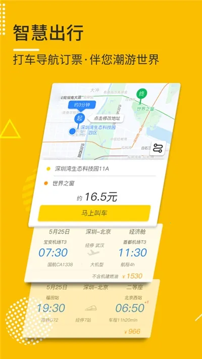 1 提供丰富出行服务,涵盖打车、订机票、订火车票、订酒店等,操作轻松完成,彻底摆脱找 APP 的烦恼。