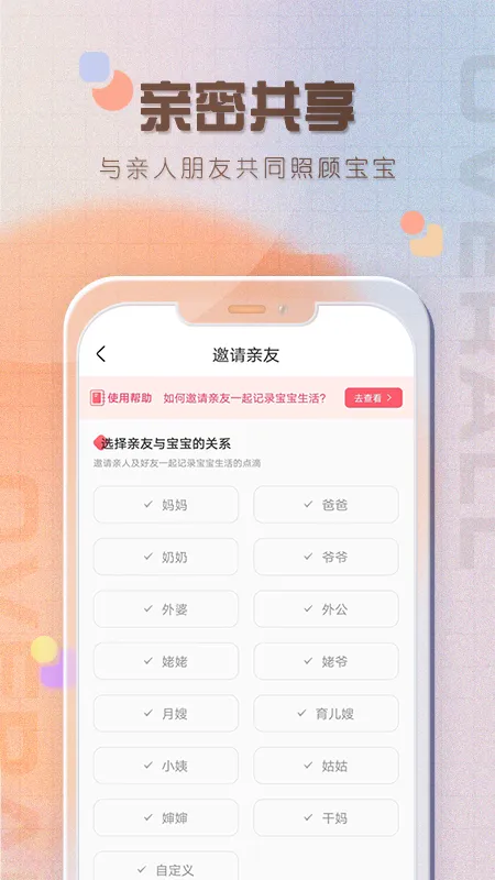 2. 支持亲友协作共享,可邀请亲朋好友共同记录宝宝信息。即便多人照顾宝宝,也不会错过任何记录时刻,减轻育儿疲劳,还能一起分享开心时刻。