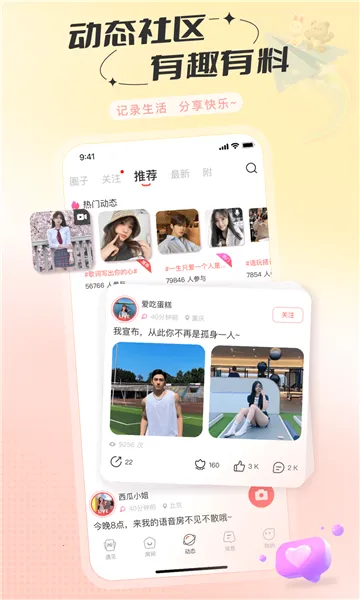 3. 具备丰富社交亮点。语音、视频、同城交友满足不同需求,实时动态展示个人魅力,汇集大咖的语音直播可互动交友做主播。