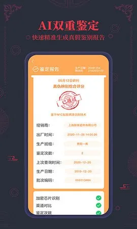 4. 保障全面。支持生成详细的真假鉴别报告,不仅显示真伪状态,还可查询酒品的生产批次产地信息等关键溯源数据,全面保障消费者权益。