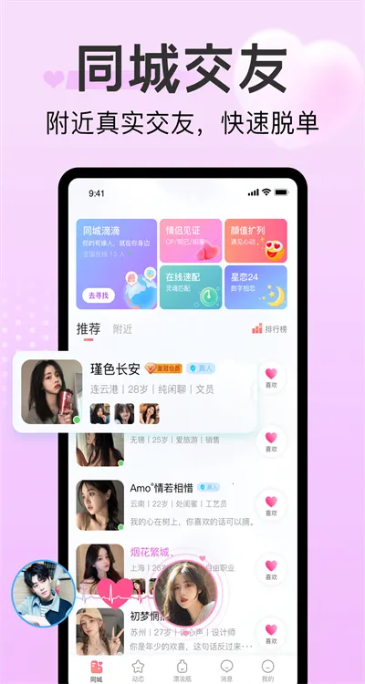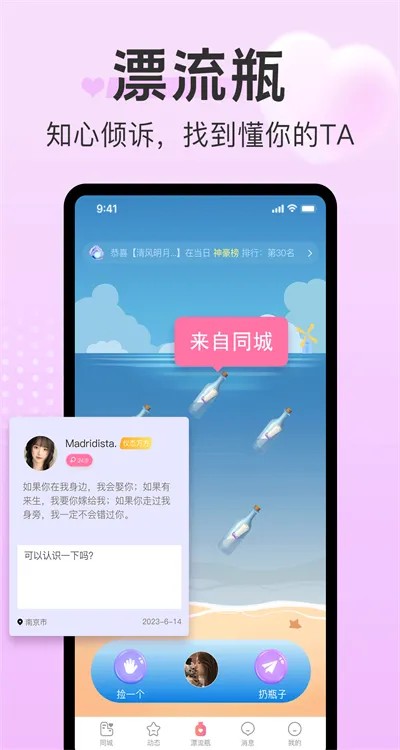 探心陌聊是同城交友平台,有全新玩法。能丢捡瓶子分享趣事,实现附近真实交友。可记录情侣成长,在线匹配表白找灵魂伴侣。有详尽资料、生活动态,颜值匹配,还优化了UI界面。