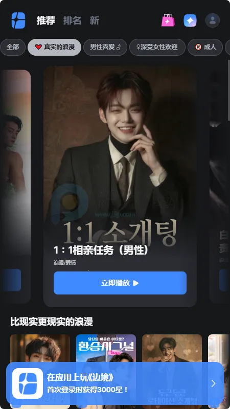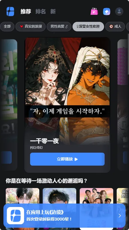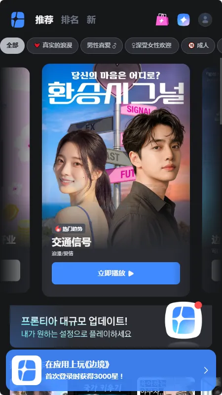 Frontia是一款沉浸式互动叙事创意平台,能打破传统图文剧情的呈现局限,带来堪比影视大片的视觉观感。平台集结海量影像音频与动态素材,依托丰富多媒体资源塑造鲜活世界观,角色互动自然灵动,能随不同场景呈现细腻反应,大幅增强代入氛围。其软件功能强大,作品彻底摆脱固化人设与老旧套路,玩家每次抉择都会牵动故事脉络,既能解锁甜蜜互动桥段,也能触发惊险奇遇或是奇幻冒险,定制专属独特剧情。同时支持普通用户发挥脑洞创作,轻松搭建专属剧情世界,体验自编自导内容的乐趣。平台常年放送福利,每日上线免费权益与精彩活动,随时畅享全新剧集内容,不管是偏爱沉浸式追剧,还是喜欢自主创作互动故事,都能在这里收获丰富趣味体验。关于frontiaAI聊天,在首页选择想要AI聊天的对象,点击立即对话即可进行聊天,输入内容后等待对方回答。登录时点击右上角人头,选择登录方式,一般选谷歌,点击注册角色,输入昵称、性别、年龄,选择同意软件政策即可。实名则是点击人头,找到账户设置,选择实名完成。