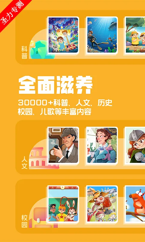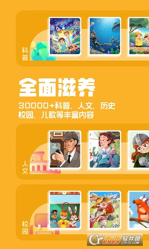 1. 内容全面丰富,精编30000有声故事,1000精品故事专辑,涵盖自然科普、历史人文、成长教育等多个品类,适用于叫早、哄睡、出行等多个场景,随时随地陪伴孩子。