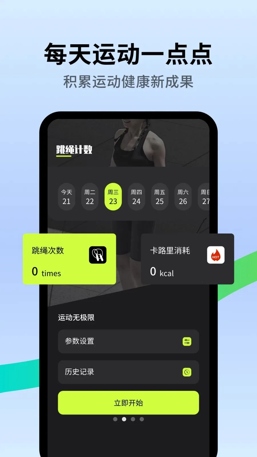 天天打卡爱跳绳是专注跳绳的健康管理应用,能计数、设运动参数、记卡路里消耗,有教程,还可记录饮食摄入,助力科学规划运动与饮食,新版本已首发 。
