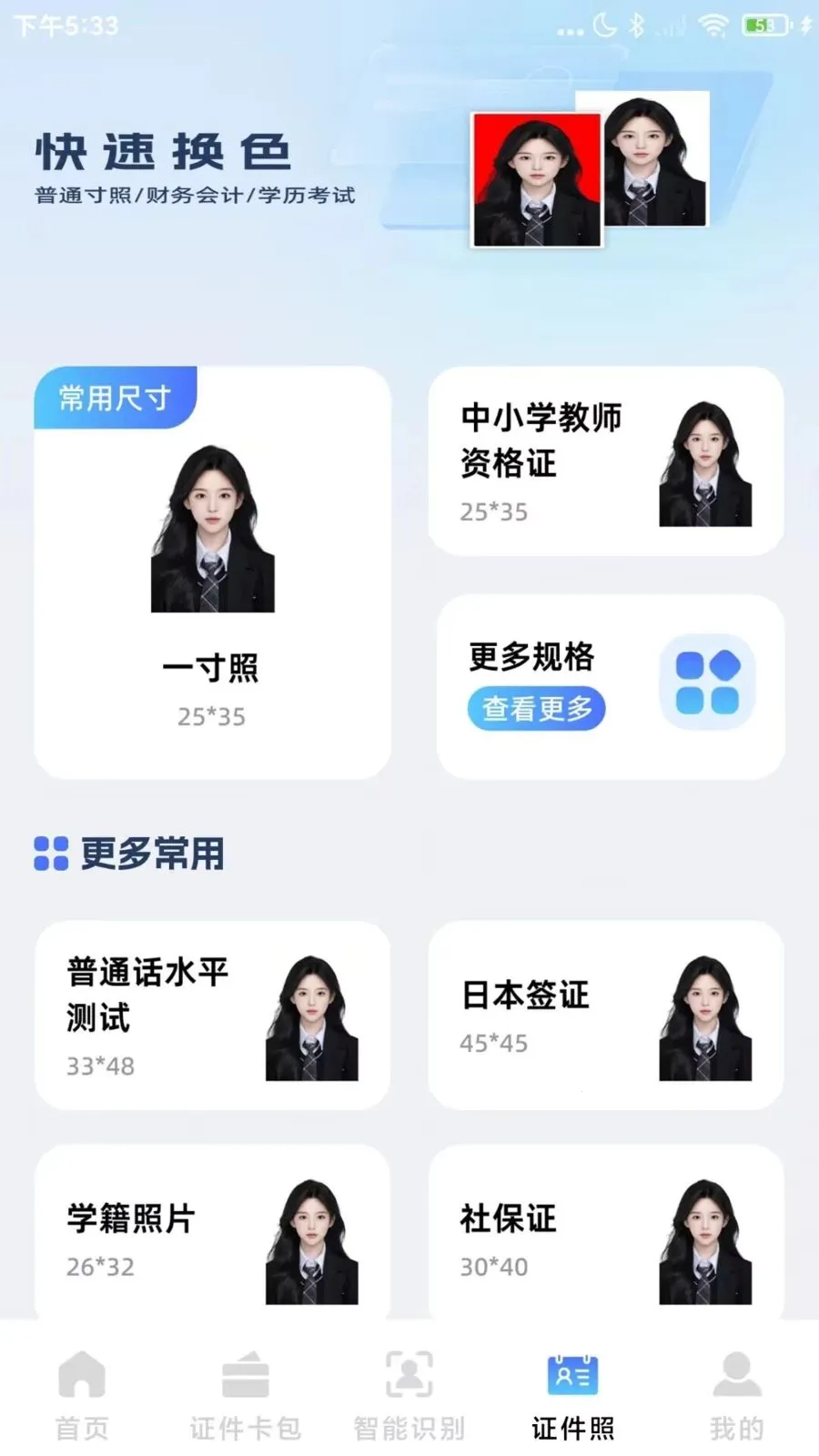 2. 支持证件照制作:具备证件照制作功能,满足您不同场景下的证件照需求。
