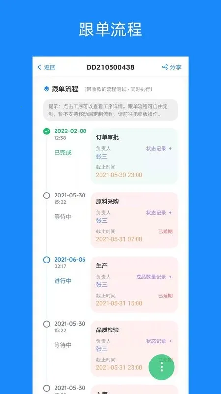 2. 在线协同:全终端平台随时随地在线跟单,订单进度实时追踪,清晰明了。