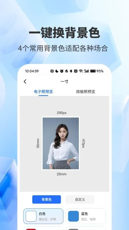 精美证件照轻松照是集拍摄、编辑与处理于一体的工具,有多种尺寸模板,能智能替换背景、优化图像。操作简单,功能集成,输出质量可靠,一键生成省时省力,背景切换灵活,文件管理便捷,是实用的日常工具。