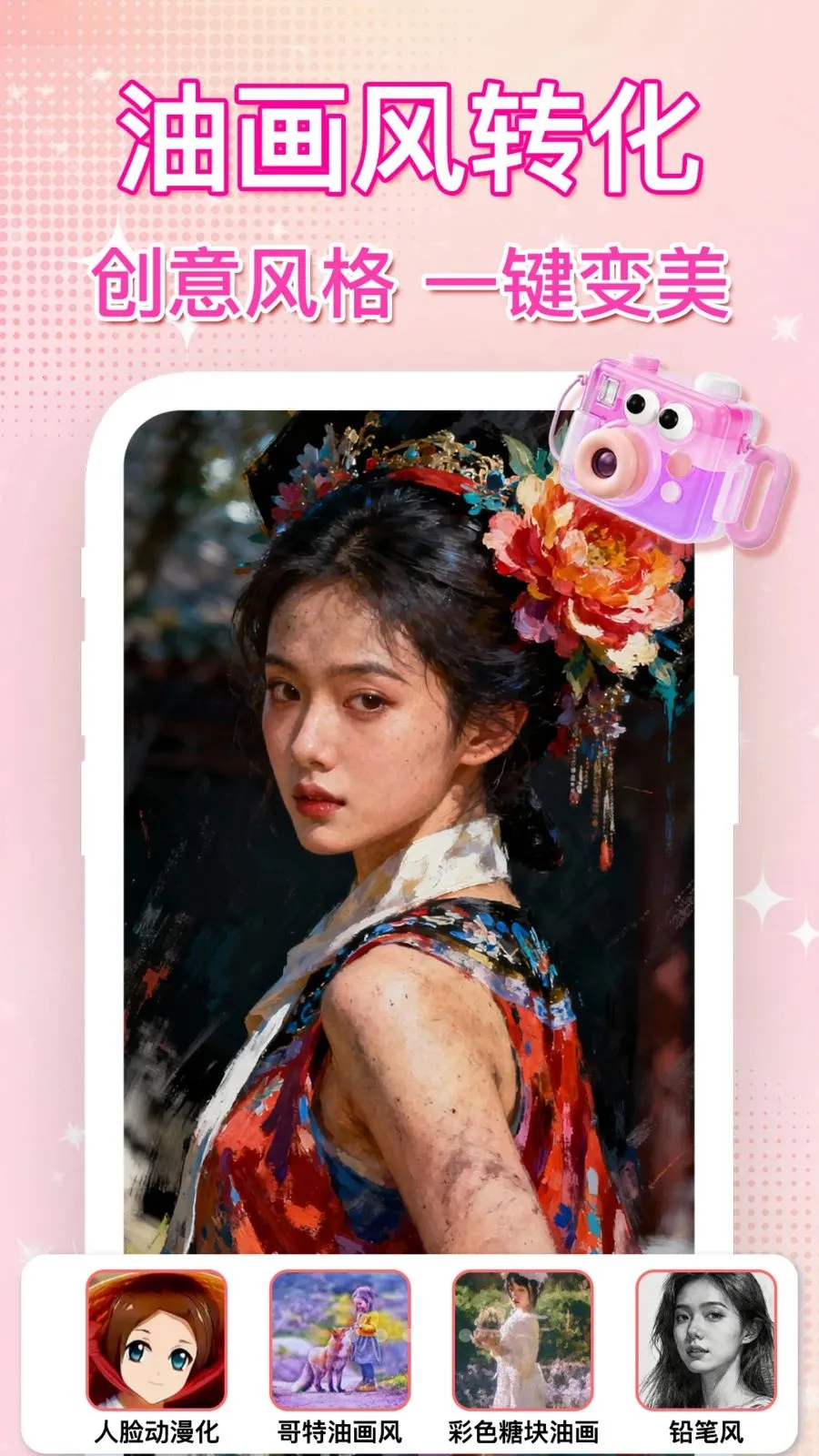 它拥有多彩相片人脸动漫化、油画风、铅笔风等多种创意风格,可随心切换,上传照片就能一键生成专属艺术大片,轻松打造专属氛围感,还原美丽。