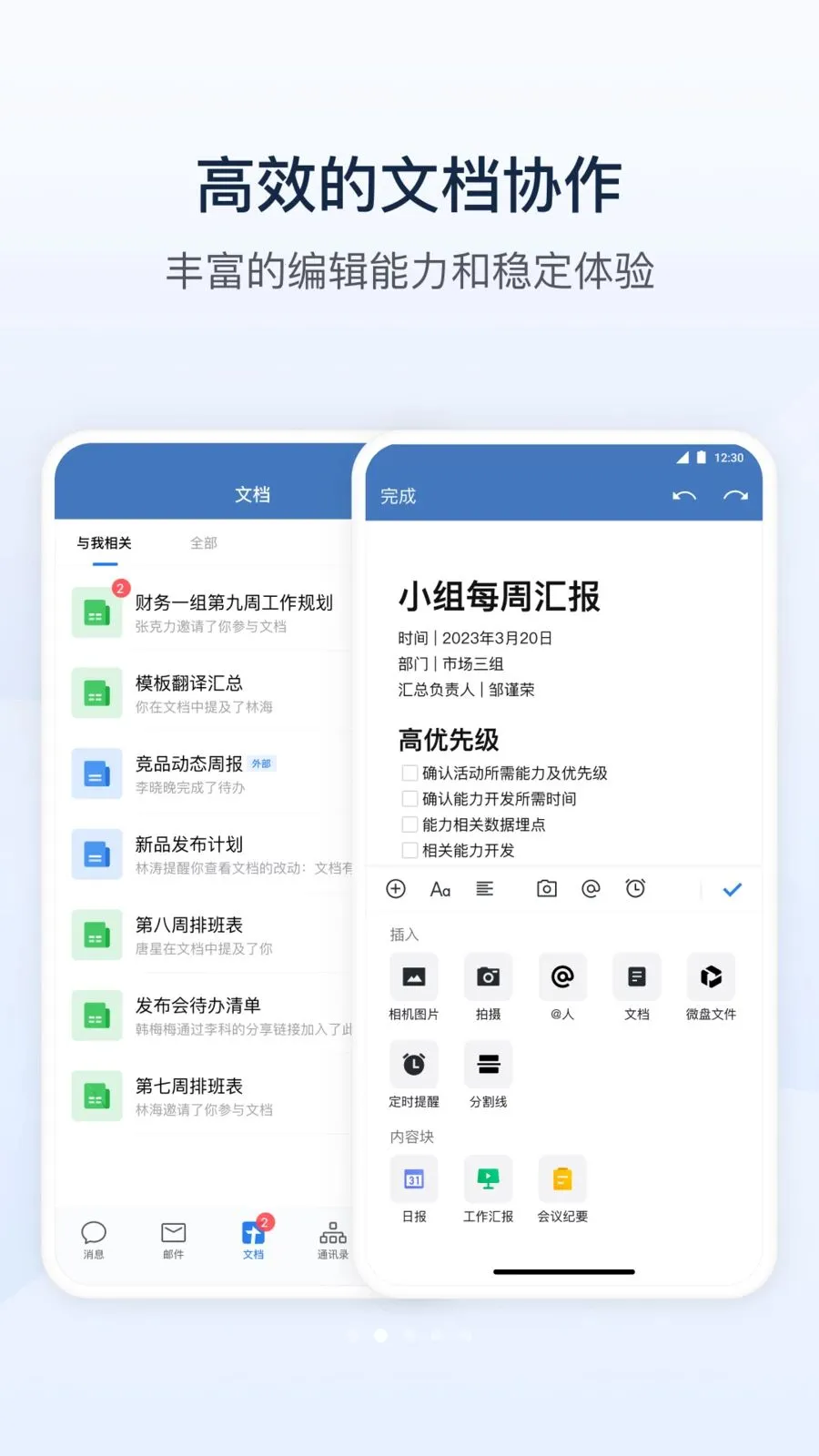 4. 提供多款效率工具,如文档有丰富编辑能力,会议高清稳定,邮件安全绿色,日程可高效组织会议,微盘方便共享文件。