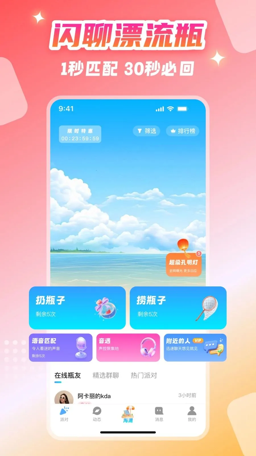 闪聊漂流瓶是专为年轻人打造的轻社交平台。支持多形式漂流瓶创作,摒弃盲目匹配,加入精准兴趣标签。优化隐私保护,上线附近人约见服务,实名认证护航。在这里可解锁匿名社交全新体验。