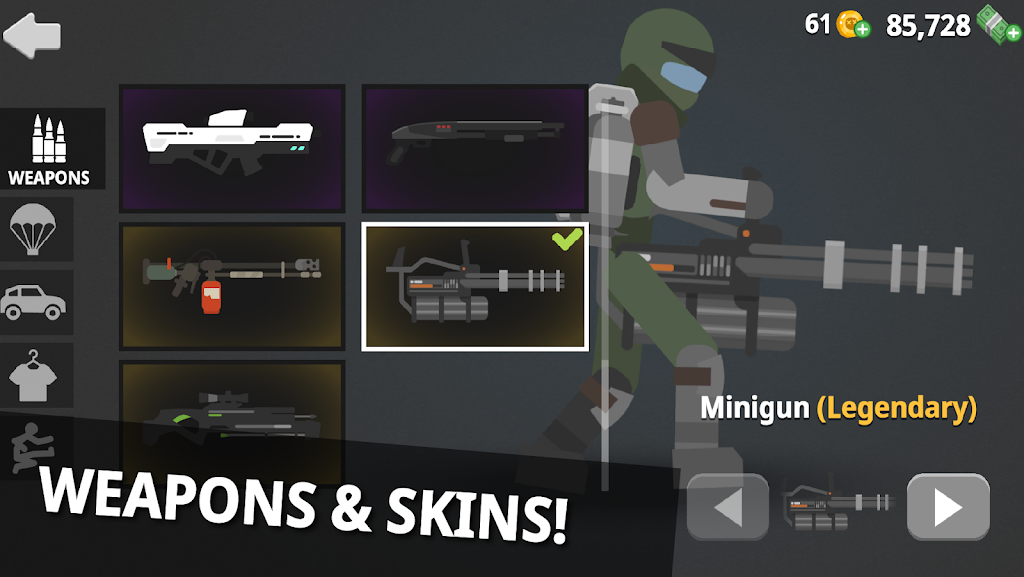 高度自由的火柴人自定义系统,玩家能自由定义专属火柴人形象,通过丰富的服装、武器和跑酷技能搭配,塑造独一无二的角色风格,还能打造个性化战斗策略。