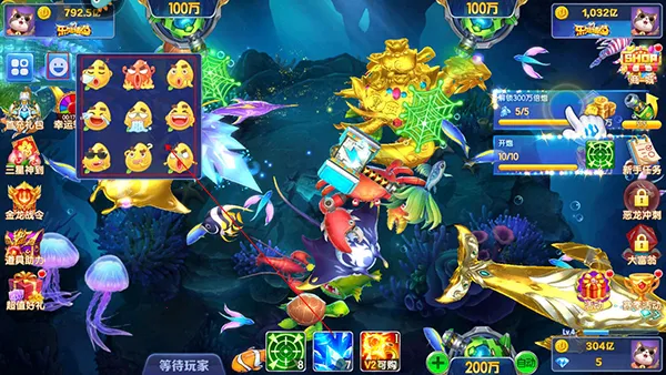 玩家可以点击左上角的四个口,打开“更多页面”,可以使用炮台切换、游戏设置、查看图鉴、切换捕鱼房间、离开房间五个功能。