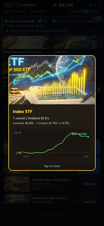 丰富的投资项目让玩家能积累被动财富。投资系统涵盖 39 种产品,涉及多领域。玩家依据市场情况投资,离线时收益也会自动累积,稳定增长财富,登录查看增值资产,成就感满满,还为后续提供资金保障。