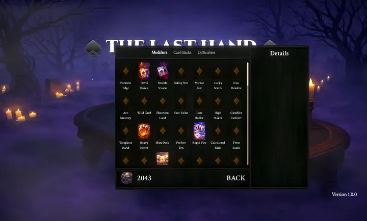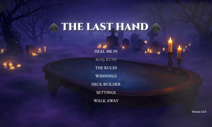 最后一手牌是一款氛围阴暗充满异域风情的二十一点类roguelike游戏,每一局牌桌都可能改变游戏走向。在被庄家主宰的闹鬼赌场中,玩家要与被诅咒的荷官、致命的Boss以及各种颠覆规则的道具展开殊死搏斗。构筑强大牌型,适应诡异新环境,在被牌桌吞噬前活到最后赢取胜利。这不是传统二十一点,每局可选择道具改变牌局走向、荷官行为,恢复生命值,惩罚冒险,奖励贪婪甚至改写规则。有些局需精心策划,有些则会演变成混乱。其特色有融合策略风险与回报的类Rogue二十一点玩法,可叠加卡牌强化效果助构筑强力卡组,有独特机制规则的荷官和Boss,还有解锁卡背等更多内容,具备卡组构筑和升级系统,哥特式暗黑风格画面营造毛骨悚然赌场氛围,Boss挑战模式和更高难度满足追求挑战的玩家,玩家每个选择都至关重要,要不让庄家成为赢家。