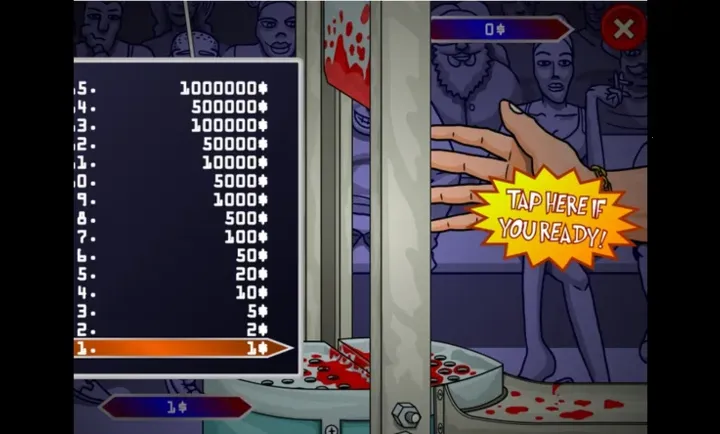 2、玩家置身游戏节目场景,有机会成为千万富翁,只需将手放在锋利断头台间拿现金,过程刺激。