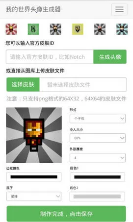 1、支持用minecraft皮肤id或上传个人皮肤来制作头像,方式多样。