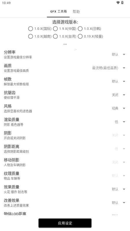 gfx工具箱画质助手适配各种版本的吃鸡手游,无论是国服、国际服还是体验服、测试服等,全部都能一键修改画质。