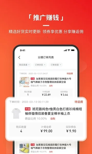 1. **全新升级首页**:精选好货实时更新,全面享受各大平台隐藏优惠,还有分享赚返佣新模式。