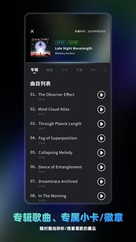 享乐派是一款创新的音乐增值服务App,它致力于打破虚拟与现实的界限,为您打造一种沉浸式的音乐生活方式。它巧妙地将实体唱片的仪式感、数字音乐的便捷性,以及充满趣味的电子卡片和徽章收藏体系融为一体。在这里,每一次与音乐的互动都不再是单向的聆听,而是一段完整的可收藏可分享的体验旅程。