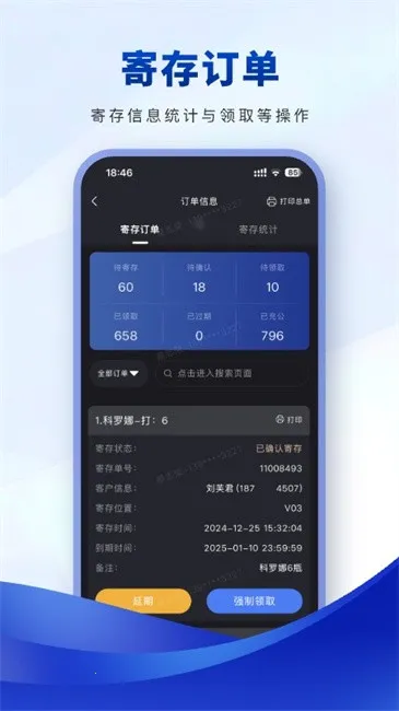 4. 有排队取号、寄存订单等功能,可实时查看与呼叫在线排队人数,进行寄存信息统计与领取等操作。