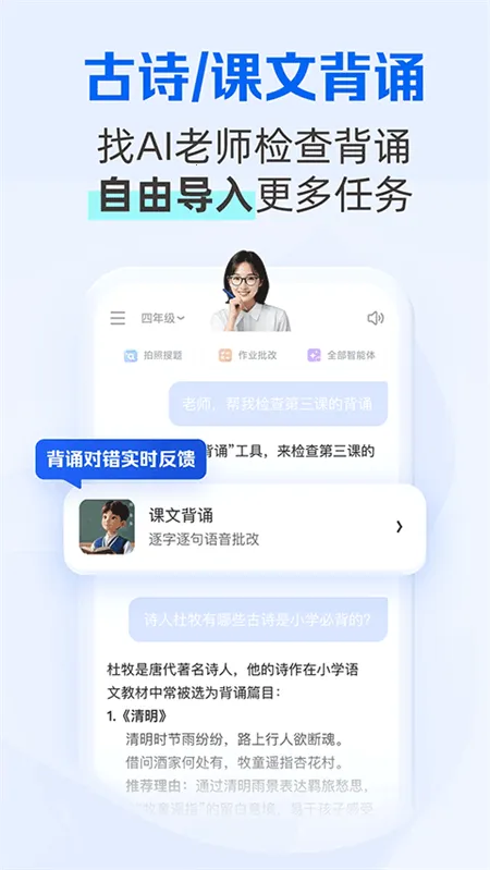 1. 有先进人工智能技术,能提供知识丰富的虚拟老师,助学生背诵古诗、讲解数学题、纠正英语发音等。