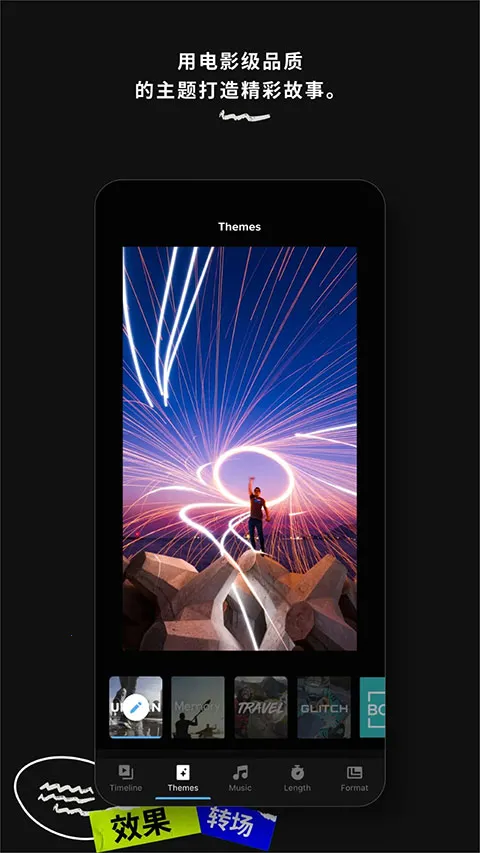 3. 配备几十种主题模板与原创配乐,视频剪辑高效又美观。