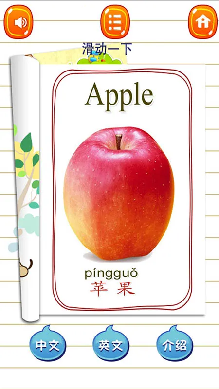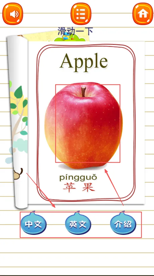 2、点击具体水果图标听取标准的中英文发音示范,跟随朗读学习正确发音和拼写方式,进行发音练习和跟读训练,掌握语言基础。