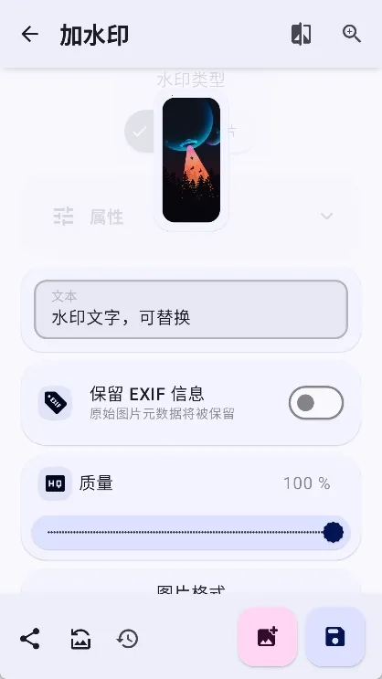 5.而在加水印功能中可以自定义水印的内容、位置、透明度等。