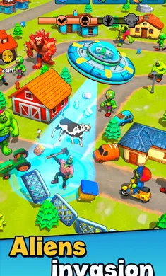 外星人vs僵尸:入侵2026融合塔防、动作与策略元素,玩家操控飞碟吞噬物体获资源升级大炮。